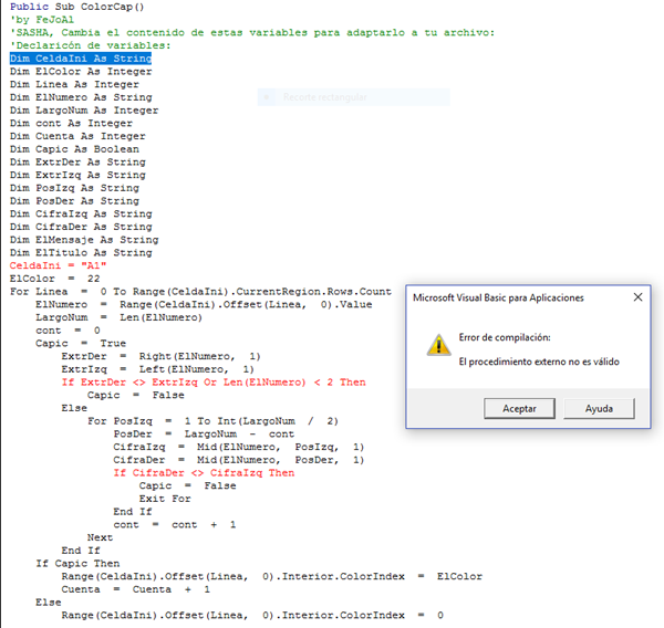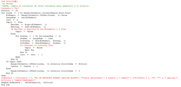 Option Explicit Sub ColorCap() 'by FeJoAl 'SASHA, Cambia el contenido de estas variables para adaptarlo a tu archivo: 'Declaricón de variables: Dim CeldaIni As String Dim ElColor As Integer Dim Linea As Integer Dim ElNumero As String Dim LargoNum As Integer Dim cont As Integer Dim Cuenta As Integer Dim Capic As Boolean Dim ExtrDer As String Dim ExtrIzq As String Dim PosIzq As Integer Dim PosDer As Integer Dim CifraIzq As String Dim CifraDer As String Dim ElMensaje As String Dim ElTitulo As String CeldaIni = "A1" ElColor = 22 For Linea = 0 To Range(CeldaIni).CurrentRegion.Rows.Count ElNumero = Range(CeldaIni).Offset(Linea, 0).Value LargoNum = Len(ElNumero) cont = 0 Capic = True ExtrDer = Right(ElNumero, 1) ExtrIzq = Left(ElNumero, 1) If ExtrDer <> ExtrIzq Or Len(ElNumero) < 2 Then Capic = False Else For PosIzq = 1 To Int(LargoNum / 2) PosDer = LargoNum - cont CifraIzq = Mid(ElNumero, PosIzq, 1) CifraDer = Mid(ElNumero, PosDer, 1) If CifraDer <> CifraIzq Then Capic = False Exit For End If cont = cont + 1 Next End If If Capic Then Range(CeldaIni).Offset(Linea, 0).Interior.ColorIndex = ElColor Cuenta = Cuenta + 1 Else Range(CeldaIni).Offset(Linea, 0).Interior.ColorIndex = 0 End If Next ElMensaje = IIf(Cuenta = 0, "NO SE ENCONTRÓ NUMERO CAPICUA ALGUNO", "Fueron detectados " & Cuenta & " número" & IIf(Cuenta > 1, "s", "") & " capicúa.") ElTitulo = "RANGO TERMINADO!" MsgBox ElMensaje, vbInformation, ElTitulo End Sub