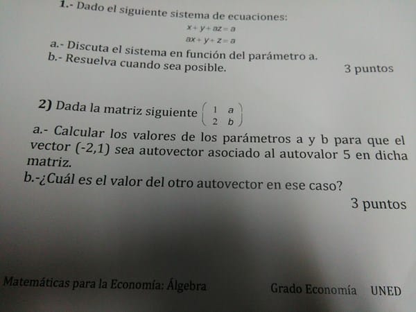$$\begin{align}&Si\\&\\&Av = \lambda v\\&\\&\lambda\text{ es valor propio y v es un vector propio correspondiente a }\lambda\\&\\&\text{Si haces la multiplicacion A por el vector (-2,1)}\\&\text{que en este editor no se puede representar tendrás}\\&(-2+a)\\&(-4+b)\\&\text{Mientras que }\lambda=5 \text{ por (-2,1) te dará}\\&(-10)\\&(\;\;\;\;\;5)\\&\\&\text{Luego tienes el sistema de ecuaciones}\\&\\&-2+a=-10\implies a=-8\\&-4+b=5\implies b=9\\&\\&\text{Y el otro valor propio se calcula}\\&|1-\lambda\quad -8|\\&|\quad2\quad 9-\lambda|=0\\&\\&(1-\lambda)(9-\lambda)+16=0\\&\\&9-10\lambda+\lambda^2+16 = 0\\&\\&\lambda^2-10\lambda+25=0\\&\\&(\lambda-5)^2=0\\&\end{align}$$