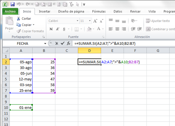 En excel, sumar registros con "sumar.si" a partir de una fecha