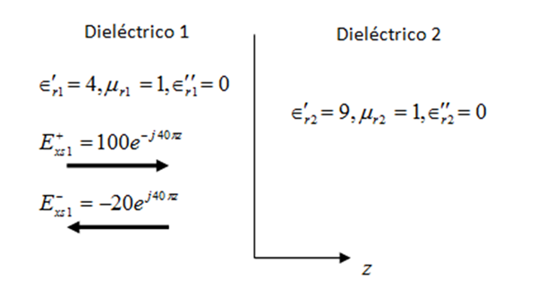 Considérese una onda de 100 V/m y 3 GHz propagándose en un material que tiene un ??1′ = 4, ??1 = 1 ? ?? ′′ = 0. La onda incide perpendicularmente sobre otro dieléctrico perfecto en la región 2, z>0, donde ??2 ′ = 9 ? ??2 = 1 (Figura 1). Se busca la ubicación de los puntos máximos y mínimo de?⃗ .