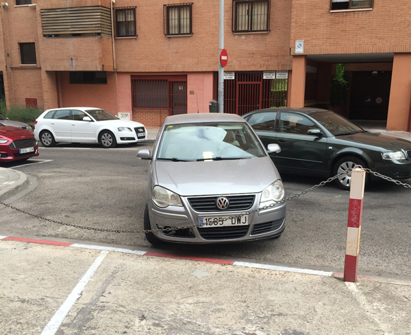 La plaza de garaje que tapono es de mi propiedad por supuesto, la cadena la quitó el coche desconocido para aparcar y la puse yo a continuación para q se viera en la foto q es una plaza privada, llevo años llamando a la policía para q multen a los vehículos que me impiden estacionar en mi plaza y me responden q si no está subido a la acera o es un vado no vienen, sí que hay una placa que indica que está prohibido aparcar, no parar, pero al carecer de flechas y estar grafiteada no queda muy claro dónde no se puede estacionar (se ve en la foto), yo que vivo aquí entiendo que esa señal es para no aparcar en el acceso a la plaza, ya que la plaza privada ya tienen cadena y está recién pintada, no necesita más adornos para saber que ahí no se puede aparcar, entonces sí que cumpliría la norma,no?.