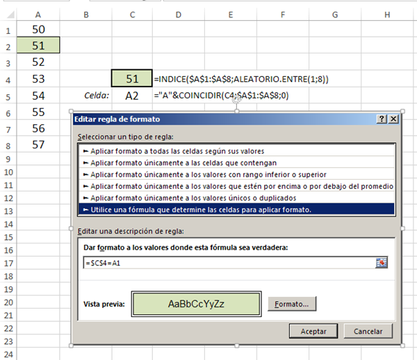 Adicionalmente, con la utilidad de Formato Condicional, le agregué la regla que ves en la ventana inferior que pinta la celda que coincide con el número elegido.