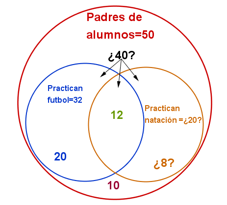 Se preguntó a 50 padres de alumnos sobre los deportes que practicaban, obteniéndose los siguientes resultados: 20 practican sólo fútbol, 12 practican fútbol y natación y 10 no practican ninguno de estos deportes. Con estos datos averigua el número de padres que practican natación, el número de ellos que sólo practican natación y el de los que practican alguno de dichos deportes.