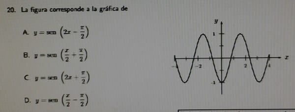 Estoy entre la A y la D porque el desface que se ve en la gràfica es positivo, el periodo de A es pi y el periodo de D es 4pi, pero me confundo porque el eje x no està en tèrminos de pi sino en nùmeros, explicaciòn por favor, gracias.