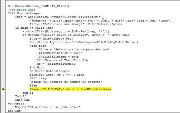 Hola, es mi primera pregunta en esta página, espero estar haciéndolo en el lugar correcto. En primer lugar saludos a todos. Mi pregunta va dirigida a Dante Amor. Tengo en un formulario, lo que ves en la imagen, y me pareció muy interesante una opción que encontré tuya donde al clicar en el botón Examinar, se abre la ventana del sistema para que selecciones una imagen, y al hacerlo te permite moverla de carpeta, funciona a la perfección pero, ¿qué debería modificar en ese mismo código para que, cuando diga que no quiero mover el archivo, en lugar de cerrarse el formulario, la imagen seleccionada se muestre en el Objeto Image (recuadro superior del botón)?, muchas gracias anticipadas por la gran labor que realizas ayudando con tus respuestas y por supuesto con tus post. Enhorabuena.