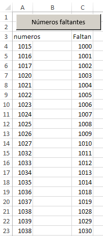 Como verás te dejé cuatro variables para que le indiques en qué celda empieza tu listado y donde quieres que escriba los faltantes (ambas asumiendo que le pondrás un título.