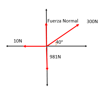 Para jalar el carrito utiliza una cuerda (flecha color roja) que forma un ángulo de 40 grados con respecto a la horizontal, con una fuerza aplicada de 300 N. La aceleración es constante y se opone una fuerza de rozamiento que tiene un valor de 10 N.