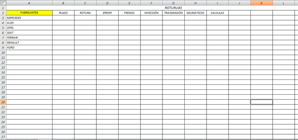 En la siguiente imagen, que es la hoja ESTD, en la columna A3 hasta A..., iré colocando las diferentes marcas de coches que vayamos arreglando. Lo que queremos es que al pulsar un botón en esta pagina, (se me ha olvidado colocarle). Valla a la hoja BD y que me arrastre, por ejemplo que de la marca Mercedes hemos tenido 2 averías por ruido una por frenos, etc. Y lo mismo con cada uno de los fabricantes que aparezcan en la columna A