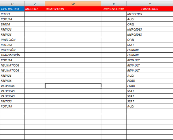 Tengo dos hojas una se llama BD y la otra ESTD, ahora con las imágenes intentaré explicar lo que preciso, esta es la hoja BD, en la cual en la columna U hay diferentes conceptos de rotura de un vehículo y en la columna Y las marcas de cada uno de los vehículos que se han averiado.