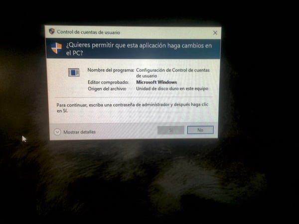 Sí en la ventana emergente del Control de cuentas de usuario me aparece deshabilitado