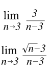 $$\begin{align}&\lim_{n\to 3} \frac 3{n-3}= \frac{3}{0}=\infty\\&\\&\text{Esto quiere decir que cuando se acerca a 3 la función toma}\\&\text{valores mayores que cualquiera que podamos dar}\\&\\&\text{En concreto por la izquierda tiende a }-\infty\\&\text{y por la dereha a }+\infty\\&\\&-----\\&\\&\lim_{n\to 3} \frac{\sqrt n-3}{n-3}= \frac {\sqrt{3}-3}{3-3}= \frac{\sqrt 3 - 3}{0}= \infty\\&\\&\text{igual que antes, pero ahora por la izquierda tiende a }+\infty\\&\text{y por la derecha a }-\infty\\&\text{ya que el numerador es negativo}\\&\\&-----------------\\&\\&\text{De todas formas te voy a resolver también este por si acaso}\\&\text{el dibujo está mal el palito de la raíz salía cortado}\\&\lim_{n\to 3} \frac{\sqrt {n-3}}{n-3}=\frac 00=\lim_{n\to 3} signo(n-3)·\frac 1{\sqrt {n-3}}= \\&\\&\lim_{n\to 3} signo(n-3)· \frac 10=\infty\\&\\&\text{Esta vez es }-\infty \text{ por la izquierda y }+\infty \text{ por la derecha}\\&\end{align}$$