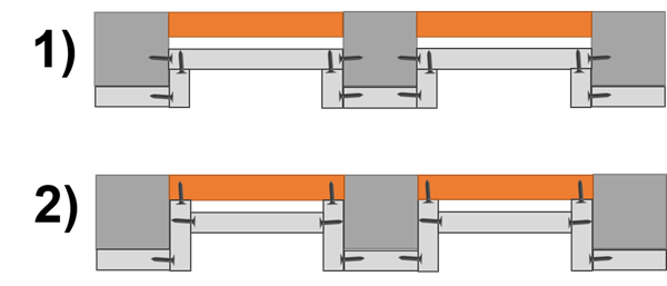 La 1ª opción me parece más estable, a costa de debilitar a los pilares. La 2ª opción quizás podría dar la impresión de un tabique más endeble. ¿Qué opináis los expertos? ¿Qué es mejor?