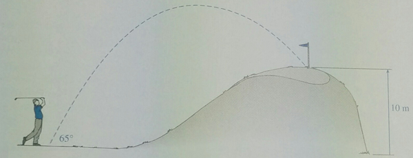 Como se muestra en la figura, una pelota de golf sale del punto de partida al ser golpeada con una velocidad de 45m/s a 65°. Si cae sobre un green ubicado 10m más arriba que el punto de partida, ¿Cuál es el tiempo que permanece en el aire? (En segundos)