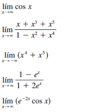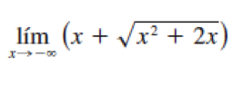 $$\begin{align}&\lim_{x\to-\infty}(x+ \sqrt{x^2+2x})=-\infty+\infty=\\&\\&\text{Como siempre en estos multiplicamos}\\&\text{y dividimos por el conjugado}\\&\\&=\lim_{x\to-\infty}(x+ \sqrt{x^2+2x})·\frac{x- \sqrt{x^2+2x}}{x-\sqrt{x^2+2x}}=\\&\\&\lim_{x\to-\infty} \frac{x^2-(x^2+2x)}{x-\sqrt{x^2+2x}}=\lim_{x\to-\infty} \frac{-2x}{x-\sqrt{x^2+2x}}=\\&\\&\text{Dividimos todos los términos por x.}\\&\text{Tengamos en cuenta que x es negativo a tender a }-\infty\\&\text{por eso cambia el signo del radical}\\&\\&=\lim_{x\to-\infty} \frac{-2}{1+\sqrt{1+\frac 2x}}=\frac{-2}{1+1}=-1\\&\\&\\&--------------------\\&\\&\lim_{x\to \infty} cosx = \text{No existe}\end{align}$$