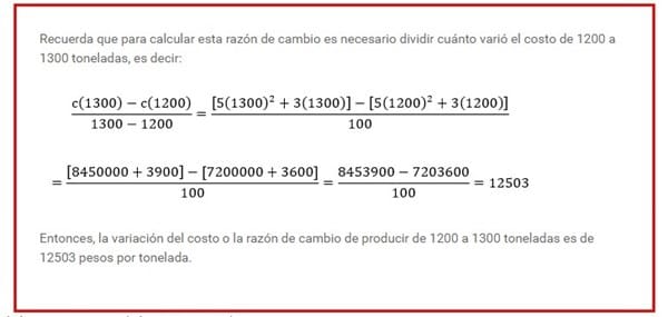 A partir de la ecuación para determinar el costo de producción en la actividad “La derivada y su función”, que fue c(x)= 5x2 + 3x, determina la razón de cambio del costo de producir de 1200 toneladas a 1300.