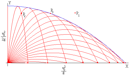 Si estudias el lugar geométrico de todas las parábolas de tiro ( ideales) que representan las distintas trayectorias de un proyectil determinado lanzado con velocidad inicial Vo y angulo variable entre 90 y 0°, encontrás que están contenidas dentro de una parábola envolvente llamada " de seguridad". Se llama así porque permite a los barcos - por ejemplo - ubicarse fuera de la trayectoria de proyectiles enemigos.