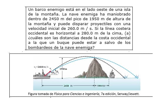 Como tienes 280 metros desde la cima de la montaña hasta la costa... serian 2450 + 280 = 2730 metros desde el cañón atacante hasta la costa opuesta... como el alcance del tiro era de 3013 metros... el barco debería ubicarse entre la costa y ( 3013 - 2730) = 283 m máximos mar adentro para estar a salvo del enemigo.