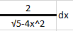 $$\begin{align}&\int \frac{2}{\sqrt{5-4x^2}}dx =\\&\\&2\int \frac{dx}{\sqrt{5\left(1-\frac{4x^2}{5} \right)}}=\\&\\&2\int \frac{dx}{\sqrt 5·\sqrt{1-\left(\frac{2x}{\sqrt 5} \right)^2}}=\\&\\&\frac 2{\sqrt 5}\int \frac{dx}{\sqrt{1-\left(\frac{2x}{\sqrt 5} \right)^2}}=\\&\\&\text{recuerda que la derivada del arcoseno de una función es}\\&\\&arcsen\;u= \frac{u'}{\sqrt{1-u^2}}\\&\\&u= \frac{2x}{\sqrt 5}\\&\\&\text{Solo te falta tener en el numerador la derivada de u } u'=\frac{2}{\sqrt{5}}\\&\\&\text{Pero es que casualmente la tienes fuera, podrías meterla dentro}\\&\\&=\int \frac{\frac{2}{\sqrt 5}}{\sqrt{1-\left(\frac{2x}{\sqrt 5} \right)^2}}=\int \left(arcsen \frac {2x}{\sqrt 5} \right)'dx=arcsen \frac {2x}{\sqrt 5}+C\end{align}$$En la práctica no haría falta dar escribir tanto ni dar tantos pasos, pero era para que se entendiera.