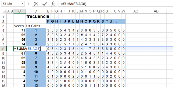 Entonces utilicé una fórmula similar para que busque esos casi 10000 numeros en las 16 columnas y cuente las coincidencias. Luego una simple suma dirá el total para cada número.