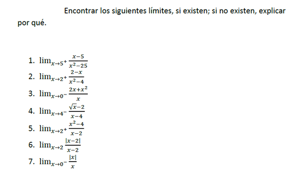 $$\begin{align}&1)\lim_{x\to 5^+} \frac{x-5}{x^2-25}=\lim_{x\to 5^+}\frac{x-5}{(x+5)(x-5)}= \\&\\&\lim_{x\to 5^+}\frac{1}{x+5}= \frac 1{10}\qquad existe\\&\\&\\&\\&2) \lim_{x\to 2^+} \frac{2-x}{x^2-25}=\lim_{x\to 2^+}\frac{2-x}{(x+2)(x-2)}= \\&\\&\lim_{x\to 2^+}\frac{1}{x+2}= \frac 1{4}\qquad existe\\&\\&\\&\\&3) \lim_{x\to0^-} \frac{2x+x^2}{x}=\lim_{x\to 0^-} \frac{x(2+x)}{x}=\\&\\&\lim_{x\to0^-}(2+x)=2\qquad existe\\&\\&\\&4) \lim_{x\to 4^-} \frac{\sqrt x -2}{x-4}= \lim_{x\to 4^-} \frac{\sqrt x -2}{(\sqrt{x}+2)(\sqrt x-2)}=\\&\\& \lim_{x\to 4^-} \frac{1}{\sqrt x +2}=\frac{1}{2+2}= \frac 14\quad existe\\&\\&\\&5) \lim_{x\to 2^+} \frac{x^2-4}{x-2}=\lim_{x\to 2^+} \frac{(x+2)(x-2)}{x-2}=\\&\\&\lim_{x\to 2^+} (x+2)= 4\qquad existe\\&\\&\\&\\&6) \lim_{x\to 2} \frac{|x-2|}{x-2}\\&\\&\text{Este es el que tiene algo de interes}\\&\text{no podemos simplificar x-2 tal cual}\\&\\&\text {el límite por la izquierda es:}\\&\lim_{x\to 2^-} \frac{|x-2|}{x-2}=\\&\\&como\; x-2<0\implies |x-2|=-(x-2)\\&\\&= \lim_{x\to 2^-} \frac{-(x-2)}{x-2}= -1\\&\\&\text{y por la derecha al ser } x-2\gt0\implies |x-2|=x-2\\&\\&\lim_{x\to 2^+} \frac{|x-2|}{x-2}=\lim_{x\to 2^-} \frac{x-2}{x-2}=1\\&\\&\text{Como los límites latrerales son distintos no existe el límite}\\&\\&\\&7. \lim_{x\to 0-} \frac{|x|}{x}=\\&\\&Como \;x\lt 0\implies |x|=-x\\&\\&=\lim_{x\to 0^-} \frac{-x}{x}=-1\qquad existe\\&\\&\end{align}$$Y eso es todo, sa lu dos.