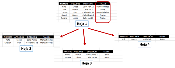 Tengo en la hoja 1 una tabla de datos (registro de personas). En ella se recogen datos: nombre, apellidos, dirección, taller al que asisten, etc. Me gustaría, si se puede, transportar los datos de la tabla principal de la hoja 1, a otras hojas en base al taller que asisten. Por ejemplo, todos las personas de manualidades a la hoja 2, los de teatro a la hoja 3, los de baile a la hoja 4, etc. Lo he intentado transportando todos los datos a cada hoja y filtrando ahí. El problema es que los filtros no son automáticos; si añado o modifico un dato en lo hoja 1, tengo que borrar los filtros en todas las hojas y aplicarlos de nuevo. No sé si se puede realizar algo parecido.