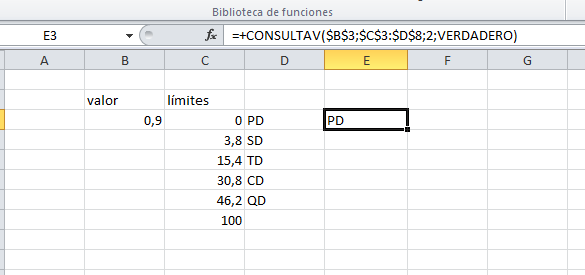 El baremo funciona de la siguiente manera, si el resultado de una operación anterior da 0,9 entonces se ubica en la primera división del baremo, pero como son 5 divisiones entonces la formula que utilicé fue: =SI(G3=AA3:AA41;"P.D.";SI(G3=AA42:AA157;"S.D.";SI(G3=AA158:AA311;"T.D.";SI(G3=AA312:AA465;"C.D.";"Q.D"))))