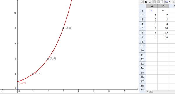 Para esta función de los conejos C = 2t tabula los valores t desde cero hasta 15 de uno en uno, e identifica los números mencionados en el ejemplo del inicio de este ejercicio. Localiza los puntos en una gráfica, o utiliza un software graficador, para ver cómo es la gráfica. Puedes apoyarte del software Geogebra (http://www.geogebra.org/)