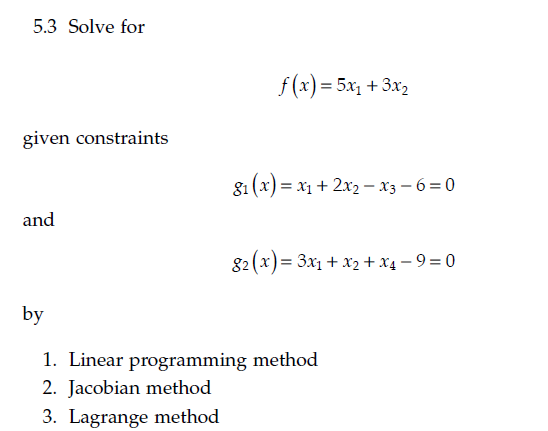 $$\begin{align}&0 + 1 · \lambda_1 + 0·\lambda_2= 0\\&\\&\lambda_1=0\\&\\&\text{Pero eso es contradictorio, la unica forma de que }\\&\text{no lo sea es que X3 no se una variable sino una constante}\\&\text{llamemosla }K_3\\&\\&\text{Entonces sería}\\&\\&\frac{\partial}{\partial X_3}(5X_1+3X_2)+\lambda_1·\frac{\partial}{\partial X_3}(X_1+2X_2+K_3-6)+\lambda_2\frac{\partial}{\partial X_3}(X_1+X_2+X_4-9)=0\\&\\&0+\lambda_1·0+\lambda_2·0 = 0\\&0+0+0=0\\&0=0\\&\\&\text{y no hay cantradicción.}\\&\\&\text{Todo esto que hemos dicho rige también para la cuarta ecuación}\\&\text{Para que no haya contradicción debe ser }X_4 \text{ constante } X_4=K_4\\&\\&\text{Por lo tanto las ecuaciones 5 y 6 son estas}\\&\\&G_1(X)= X_1+2X_2+ K_3 -6=0\\&\\&G2(X)=3X_1+ X_2+K_4 -9=0\\&\\&\text{Y se soluciona como antes, primera por (-3) la sumo a segunda}\\&\\&-5X_2-3K_3+K_4+9=0\\&\\&X_2= \frac{9-3K_3+K_4}{5}\\&\\&X_1=-2· \frac{9-3K_3+K_4}{5}-K_3+6=\frac{12+K_3-2K_4}{5}\\&\\&\text{Ahora veremos cuáles valores de }K_3\; y\; K_4\\&\text{optimizan la función objetivo F}\\&\text{Siempre en el supuesto de que son valores no negativos}\\&\\&F(X) =5X_1+3X_2=12+K_3-2K_4+\frac{27-9K_3+3K_4}{5}=\\&\\&\frac{60+5K_3-10K_4+27-9K_3+3K_4}{5}=\\&\\&\frac{87-4K_3-7K_4}{5}\\&\\&\text{Muy bien, K3 y K4 restan, luego la forma de}\\&\text{maximizar F(X) siendo }\;K_3\ge0\quad y \quad K_4\ge 0\\&\text{es con }K_3=0, \;K_4=0\\&\\&\text{con lo cual tendremos los valores definitivos}\\&X_1= \frac {12}5, \quad X_2= \frac 95,\quad X_3=0,\quad X_4=0\\&\\&X_{max}=\left(\frac {12}5,\; \frac 95,\;0,\;0 \right)=(2.4,\;\;1.8,\;\;0,\;\;0)\end{align}$$