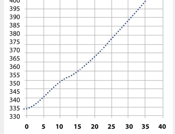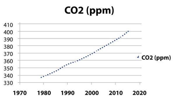 A continuación se muestra una gráfica de los datos obtenidos por este centro de monitoreo1 del promedio anual de CO2 sobre la superficie del mar, para más información puedes consultar la página del observatorio directamente.
