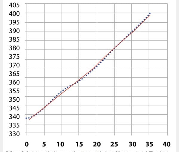 El observatorio del volcán Mauna Loa, en Hawái, se dedica al monitoreo de la concentración de CO2 sobre la superficie de los mares, teniendo un registro desde el año 1980 hasta 2015. Con base en un proceso estadístico, similar al que se revisó en el Módulo 17, fue posible establecer un modelo matemático que aproxima la concentración del CO2, por año.