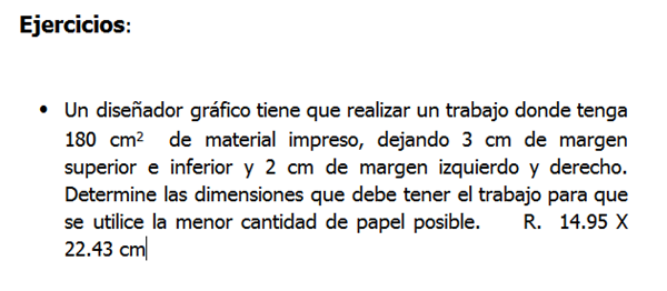 $$\begin{align}&b-4 = \frac{180}{h-6}\\&\\&b = \frac{180}{h-6}+4 \\&\\&\text{Con esto, el área se podrá poner en función de una sola variable}\\&\\&A(h) = \left(\frac{180}{h-6}+4\right) ·h = \frac{180h}{h-6}+4h\\&\\&\text{derivamos e igualamos a 0 para obtener el mínimo}\\&\\&A'(h)= 180 \frac{h-6-h}{(h-6)^2}+4= -\frac{1080}{(h-6)^2}+4=0\\&\\&4=\frac{1080}{(h-6)^2}\\&\\&(h-6)^2= \frac{1080}{4}=270\\&\\&h-6 = \sqrt{270}\\&\\&h= 6+\sqrt{270}\\&\\&\\&\text{Es un mínimo porque la derivada segunda en él es positiva}\\&\\&A''(h)=\frac{1080·2}{(h-6)^3}\\&\\&\text{Compruébalo tú mismo si quieres}\\&\text{Y ahora calculamos la base correspondiente}\\&\\&b = \frac{180}{h-6}+4 = \frac{180}{\sqrt{270}}+4\\&\\&\text{No hace falta dejarlas mejor, echamos mano ya a la calculadora}\\&\\&h= 6+\sqrt{270}\approx 22.43167673\, cm\\&\\&b= \frac{180}{\sqrt{270}}+4\approx14.95445115\,cm\end{align}$$: