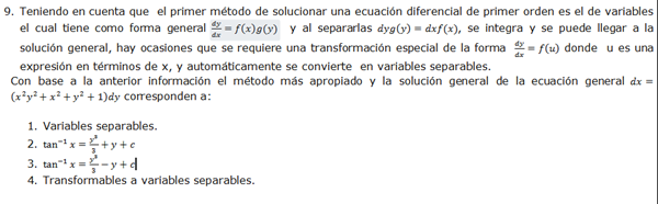El método más apropiado y la solución general de la ecuación general dx=(x^2 y^2+x^2+y^2+1)dy corresponden a: