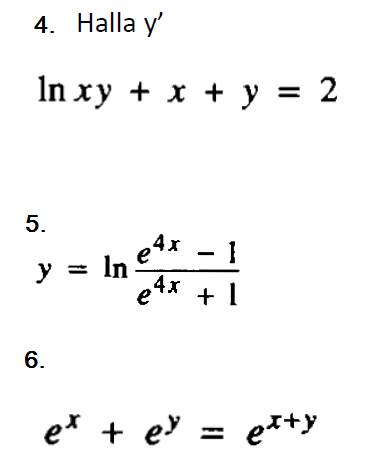$$\begin{align}&4)\\&\\&ln \,xy+x+y = 2\\&\\&\frac{y+xy'}{xy}+1+y'=2\\&\\&\frac 1x+\frac {y'}y+1+y' = 2\\&\\&\frac {y'}y+y' = 1-\frac 1x\\&\\&y'\left(\frac 1y +1  \right)= \frac{x-1}{x}\\&\\&y'=\frac{\frac{x-1}{x}}{\frac 1y+1}= \frac{\frac{x-1}{x}}{\frac {1+y}y}= \frac{y(x-1)}{x(1+y)}=\frac{xy-1}{xy+1}\\&\\&------------------\\&\\&6)\\&\\&e^x+e^y=e^{x+y}\\&\\&e^x + e^y·y' = e^{x+y}(1+y')\\&\\&e^x + e^y·y' = e^{x+y}+y'e^{x+y}\\&\\&y'e^y - y'e^{x+y}= e^{x+y}-e^x\\&\\&y'(e^y-e^{x+y})= e^{x+y}-e^x\\&\\&y'=\frac{e^{x+y}-e^x}{e^y-e^{x+y}}\\&\end{align}$$