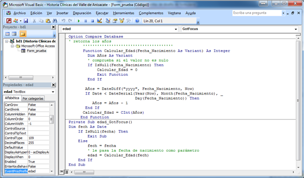 Estoy realizando una base de datos en access y necesito que en el formulario donde exporte los campos al digitar la fecha de nacimiento me salga automáticamente en el CAMPO EDAD, la edad de esa persona, ya que solo lo he podido realizarlo por consulta y así no me sirve porque necesito que se visualice en el formulario y sea guardado en los campos de la tabla.