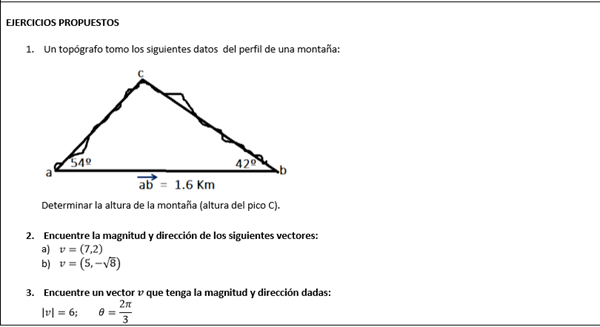 $$\begin{align}&\frac hx=tg\,54º\implies x= \frac{h}{tg\,54º}\\&\\&\frac{h}{1.6-x}= tg\,42º\implies\\&\\&h=(1.6-x)·tg\,42º\\&\\&h=\left(1.6- \frac{h}{tg\,54º} \right)tg\,42º=\\&\\&h = 1.6·tg\,42º- \frac{h·tg\,42º}{tg\,54º}\\&\\&h+\frac{h·tg\,42º}{tg\,54º} = 1.6·tg\,42º\\&\\&h\left(1+\frac{tg\,42º}{tg\,54º} \right)= 1.6·tg\,42º\\&\\&h= \frac{1.6·tg\,42º}{1+\frac{tg\,42º}{tg\,54º}}\approx0.8709118\,km\\&\\&\\&2) \\&\\&||v||= \sqrt{7^2+2^2}=\sqrt{49+4}=\sqrt {53}\approx7.28010989\\&\\&\alpha= arctg \frac{2}{7}= 15.9453959º\\&\\&\text{Está bien porque es del primer cuadrante}\\&\\&-------\\&\\&||v||= \sqrt{5^2+(-\sqrt 8)^2}= \sqrt{25+8}=\sqrt {33}\approx5.744562647\\&\\&\alpha=arctg \frac{- \sqrt 8}{5}= -29.4962086º\\&\\&\text{está bien porque es del 4º cuadrante, también puede ponerse}\\&\\&\alpha=360º -29.4962086º=330.5037915º\\&\\&\\&3)\\&\\&v=6\left(\cos \frac{2\pi}{3}, sen \frac{2\pi}{3}\right)=\\&\\&\frac{2\pi}3 rad = \frac{360º}{3}=120º\\&\\&=6\left(-\frac 12, \frac{\sqrt 3}{2}\right)=(-3, 3 \sqrt 3)\end{align}$$Y eso es todo, espero que te sirva, no olvides valorar la respuesta.