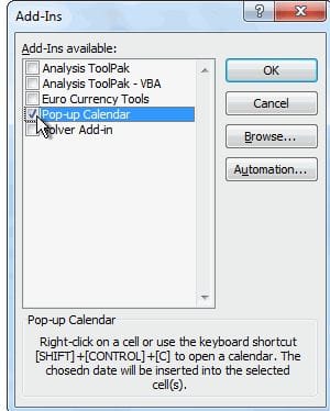 De todos modos, tienes un addin que hará que en el Menú contextual (botón derecho) tengas la opción de insertar una fecha. También podrás acceder al calendario con CTRL+SHIFT+C con la celda donde quieras poner la fecha seleccionada.