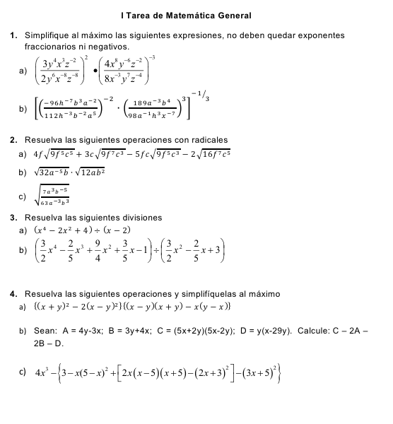 $$\begin{align}&a) \bigg(\frac{3y^4x^3z^{-2}}{2y^6x^{-8}z^{-8}}\bigg)^2\cdot\bigg(\frac{4x^8y^{-6}z^{-2}}{8x^{-3}y^7z^{-4}}\bigg)^{-3}=\\&\bigg(\frac{3}{2}x^{11}y^{-2}z^{6}\bigg)^{2}\cdot\bigg(\frac{1}{2}x^{11}y^{-13}z^{2}\bigg)^{-3}=\\&\bigg(\frac{9}{4}x^{22}y^{-4}z^{12}\bigg)\cdot\bigg(8x^{-33}y^{39}z^{-6}\bigg)=\\&18x^{-11}y^{35}z^{6} \text{Puedes dejarlo así, o como}\\&=18 \frac{y^{35}z^{6} }{x^{11}}\\&---\\&b) \bigg[\bigg(\frac{-96h^{-7}b^3a^{-2}}{112h^{-3}b^{-2}a^5}\bigg)^{-2}\cdot\bigg(\frac{189a^{-3}b^4}{98a^{-1}h^3x^{-7}}\bigg)^{3}\bigg]^{-1/3}=\\&\bigg[\bigg(\frac{-6}{7}h^{-4}b^5a^{-7}\bigg)^{-2}\cdot\bigg(\frac{27}{14}a^{-2}b^4h^{-3}x^{7}\bigg)^{3}\bigg]^{-1/3}=\\&\bigg[\bigg(-\frac{49}{36}h^{8}b^{-10}a^{14}\bigg)\cdot\bigg(\frac{19683}{2744}a^{-6}b^{12}h^{-9}x^{21}\bigg)\bigg]^{-1/3}=\\&\bigg[-\frac{964467}{98784}h^{-1}b^{2}a^{8}x^{21}\bigg]^{-1/3}=\\&\bigg[-\frac{98784}{964467}h^{}b^{-2}a^{-8}x^{-21}\bigg]^{1/3}=\\&-\frac{\sqrt[3]{98784}}{\sqrt[3]{964467}}h^{1/3}b^{-2/3}a^{-8/3}x^{-7}\\&\text{Creo que puede quedar así, pero podrías afinarla un poco más viendo que}\\&=-\frac{\sqrt[3]{14^3\cdot 36}}{\sqrt[3]{27^3\cdot49}}h^{1/3}b^{-2/3}a^{-8/3}x^{-7}=\\&-\frac{14\cdot \sqrt[3]{36}}{27\cdot \sqrt[3]{49}}h^{1/3}b^{-2/3}a^{-8/3}x^{-7}\end{align}$$