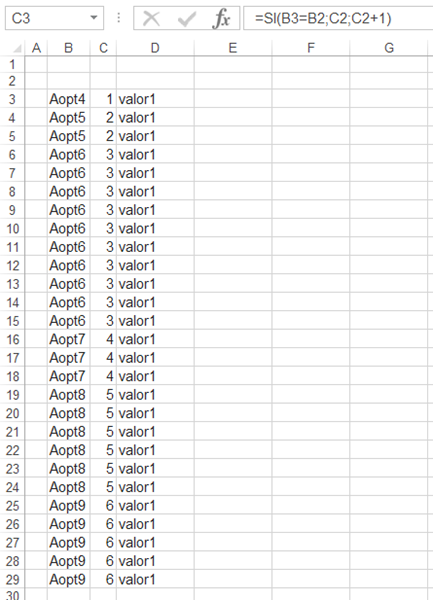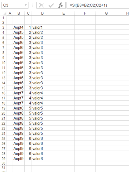 Y necesito en la siguiente columna que progresivamente solo tomando los datos repetidos y en ordenlos diferencie, esta seria la idea: