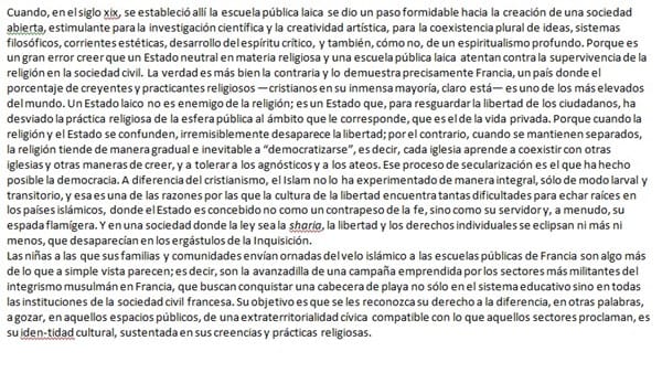 Hace la premisa de que si se permitiera llevar velo, esto implicaría en realidad aceptar los motivos del velo y otros aspectos de la cultura musulmana que atentan de manera mucho más visible en los derechos de las mujeres tal y como entendemos nosotros la libertad del individuo.