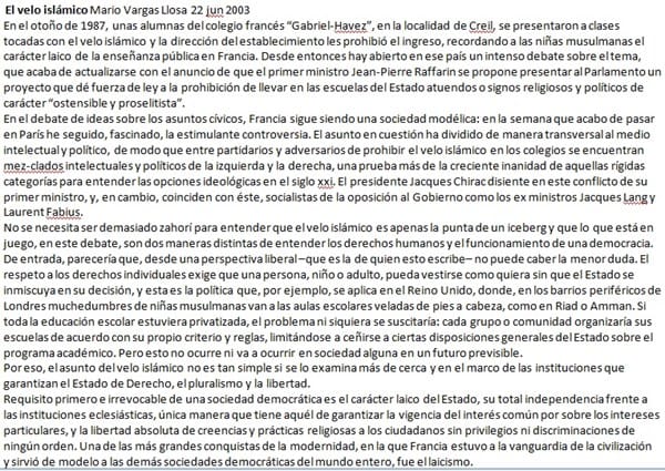 La conclusión a la que llega el escritor es bien distinta a la que según explica se llegó para el caso de Londres, en que la libertad individual consiste en permitir el velo. En este caso, se entiende que para defender la libertad individual se debe hacer justo lo contrario, es decir, prohibir el velo. El argumento es que permitirlo supone en realidad no solo el consentimiento de una práctica represiva sino que atenta contra los principios por los que se rige nuestra sociedad lo cual sería una contradicción y significaría poner en riesgo a la propia sociedad.