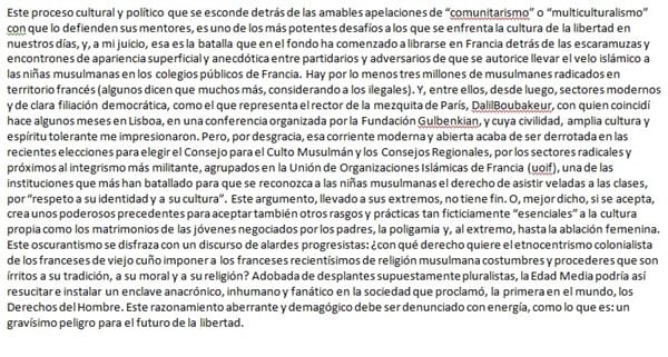 Hace la premisa también con carácter de pronóstico, de que este primer objetivo del velo, es solo un precedente a la verdadera pretensión de la comunidad musulmana de conseguir un trato de diferenciación, es decir, que exista una doble ley que permita un trato para las mujeres musulmanas y otro para las europeas, lo que vendría a ser el modo de imponer su cultura dentro de la nuestra.