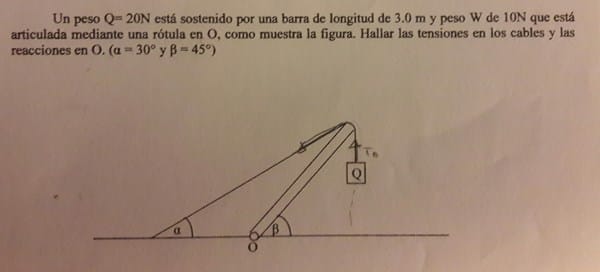 (Lw/2 + WL) cos 45° - T sen 15° = 0 ........................con W= 20 N y w= 10N.