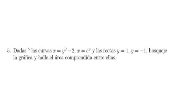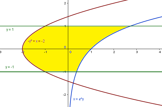 $$\begin{align}&A=\int_{y_1}^{y_2}(f(y)-g(y))\;dy\\&\\&A=\int_{-1}^1 (e^y-(y^2-2))dy=\\&\\&\int_{-1}^1(e^y-y^2+2)dy=\\&\\&\left[e^y-\frac {y^3}3+2y \right]_{-1}^1=\\&\\&e-\frac 13+2-e^{-1}-\frac 13+2=\\&\\&4-\frac 23+ e - \frac 1e=\frac {10}3+e-\frac 1e\end{align}$$Y eso es todo, sa lu dos.