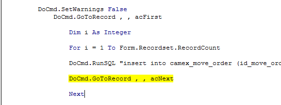 Estoy creando un formulario continuo en el cual inserto datos, pero al momento de tratar de insertarlos en una tabla solo me inserta el primer dato (Tengo un botón de insertar donde tengo mi código), desconozco mucho de Access, espero me puedan apoyar, cuento con tres campos. Texto 1, texto 2 y texto 3, que vienen referenciados de otra tabla.