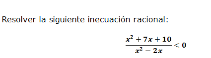 $$\begin{align}&Numerador: x^2+7x+10 = 0\\&x_{1,2} = \frac{-7\pm \sqrt{7^2-4\cdot1\cdot10}}{2\cdot1}= \frac{-7\pm 3}{2}=\\&x_1=-2, x_2=-5\\&Denominador: x^2-2x=0\\&x^2-2x=x(x-2)=0\\&x=0, x=2\\&\text{tenemos los puntos de interés que son {-2,-5,0,2}, que definen los siguientes intervalos}\\&I_1=(-\infty,-5), I_2=(-5,-2),I_3=(-2,0), I_4=(0,2), I_5=(2,+\infty)\\&\text{En cada uno de esos intervalos, la función tendrá el punto de cualquier punto dentro de ese intervalo, veamos cada caso, donde me voy a enfocar en el signo de la fracción}\\&I_1=(-\infty,-5), elijo\ x = -10 \to \frac{(-10)^2+7\cdot(-10)+10}{(-10)^2-2\cdot(-10)}=\frac{+}{+}>0 \to NO\\&I_2=(-5,-2), elijo\ x = -4 \to \frac{(-4)^2+7\cdot(-4)+10}{(-4)^2-2\cdot(-4)}=\frac{-}{+}<0 \to SI\\&I_3=(-2,0), elijo\ x = -1 \to \frac{(-1)^2+7\cdot(-1)+10}{(-1)^2-2\cdot(-1)}=\frac{+}{+}>0 \to NO\\&I_4=(0,2), elijo\ x = 1 \to \frac{1^2+7\cdot 1+10}{1^2-2\cdot 1}=\frac{+}{-}<0 \to SI\\&I_5=(2,+\infty), elijo\ x = 10 \to \frac{10^2+7\cdot 10+10}{ 10^2-2\cdot 10 }=\frac{+}{+}>0 \to NO\\&Solución: I_2 \cup I_4 = (-5,-2) \cup (0,2)\end{align}$$Salu2