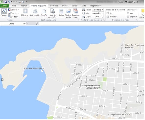Tengo una hoja en Excel que tiene como fondo una imagen de un mapa, resulta que cuando me ubico en una celda, por ejemplo la celda CN32. Ésta está ubicada exactamente sobre un sitio en este mapa, en este ejemplo (imagen) " campo de fútbol la castellana" pero cuando aumento o disminuyo el zoom este lugar ya no me queda ubicado en la misma celda ¿Cómo hago para que aunque cambié el Zoom los lugares queden siempre en la misma celda?