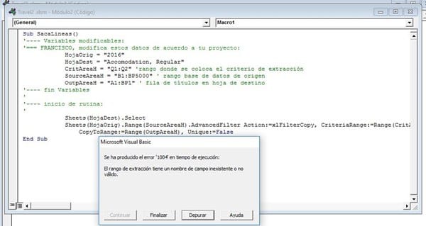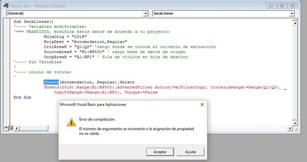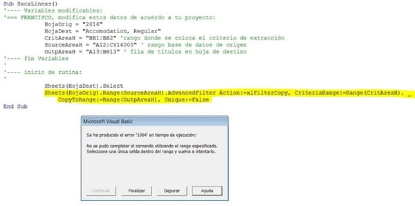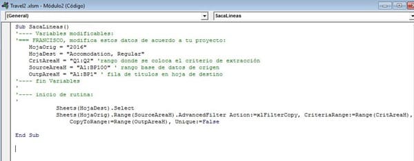 Sub SacaLineas() '---- Variables modificables: '=== FRANCISCO, modifica estos datos de acuerdo a tu proyecto: HojaOrig = "2016" HojaDest = "Accomodation,Regular" CritAreaH = "BB1:BB2" 'rango donde se coloca el criterio de extracción SourceAreaH = "A12:CY14000" ' rango base de datos de origen OutpAreaH = "A13:BH13" ' fila de títulos en hoja de destino '---- fin Variables ' '---- inicio de rutina: ' Sheets(HojaDest).Select Sheets(HojaOrig).Range(SourceAreaH).AdvancedFilter Action:=xlFilterCopy, CriteriaRange:=Range(CritAreaH), _ CopyToRange:=Range(OutpAreaH), Unique:=False End Sub