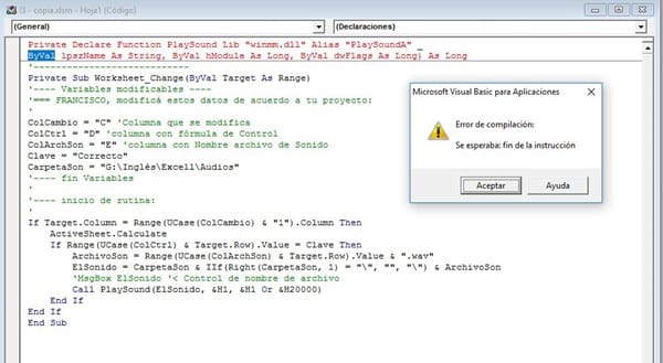 Private Declare Function PlaySound Lib "winmm.dll" Alias "PlaySoundA" _ ByVal lpszName As String, ByVal hModule As Long, ByVal dwFlags As Long) As Long '---------------------------- Private Sub Worksheet_Change(ByVal Target As Range) '---- Variables modificables ---- '=== FRANCISCO, modificá estos datos de acuerdo a tu proyecto: ' ColCambio = "C" 'Columna que se modifica ColCtrl = "D" 'columna con fórmula de Control ColArchSon = "E" 'columna con Nombre archivo de Sonido Clave = "Correcto" CarpetaSon = "G:\Inglés\Excell\Audios" '---- fin Variables ' '---- inicio de rutina: ' If Target.Column = Range(UCase(ColCambio) & "1").Column Then ActiveSheet.Calculate If Range(UCase(ColCtrl) & Target.Row).Value = Clave Then ArchivoSon = Range(UCase(ColArchSon) & Target.Row).Value & ".wav" ElSonido = CarpetaSon & IIf(Right(CarpetaSon, 1) = "\", "", "\") & ArchivoSon 'MsgBox ElSonido '< Control de nombre de archivo Call PlaySound(ElSonido, &H1, &H1 Or &H20000) End If End If End Sub
