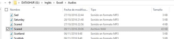 Imagino que habrás controlado que los archivos están efectivamente en la carpeta G:\Inglés\Excell\Audios, que los archivos sean .wav reales (no basta con cambiarle la extensión al archivo).