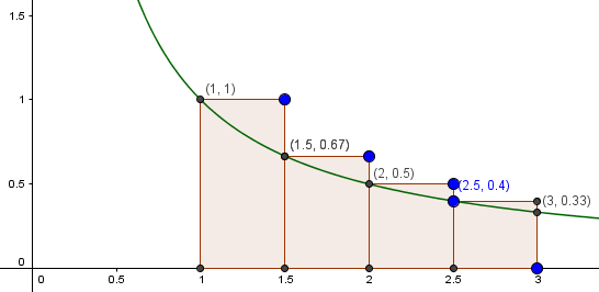 $$\begin{align}&f(x)= 1/x, 1 ≤ x ≤ 3, para 4 intervalos iguales\end{align}$$